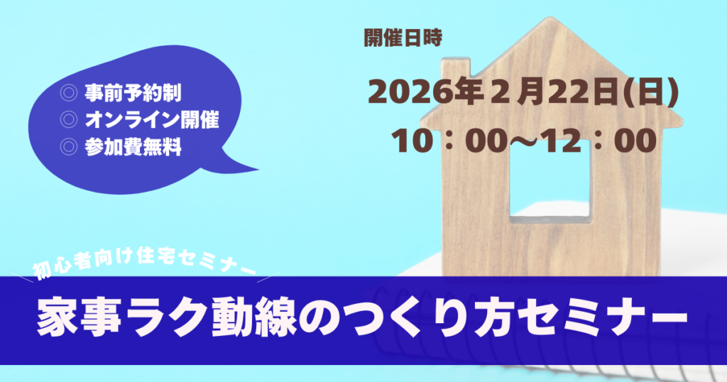 今回ご案内する「家事ラク動線のつくり方セミナー」では、家事の負担を減らし、暮らしが自然と整う間取りの考え方を、初心者でも分かりやすく学べる内容になっています。本記事では、セミナーで学べるポイントや、参加することで得られるメリットを詳しくご紹介します。